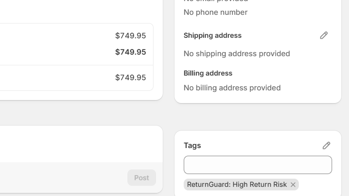 - Automated Risk Tagging: Orders from repeat offenders get a glaring 'HIGH RISK' tag directly in your Shopify orders dashboard.