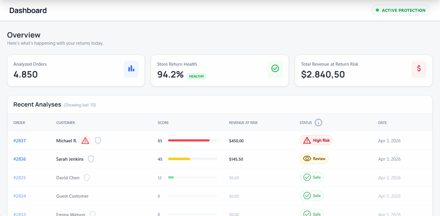 Are customers treating your store like a free rental service? IP blockers and standard AI algorithms are useless against customers using their own real credit cards to buy, wear, and return. ReturnGuard's behavioral tracking flags policy abusers and serial returners instantly.